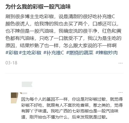 甚至这个“好吃”的判断是由基因决定的。彩椒属于茄科植物,会有一种天然苦味,虽然不明显,但苦味在人类进化基因中是一种危险信号,导致有的人会本能地排斥这种味道,从而产生类似过敏的反应,比如会觉得它有一股“汽油味”。