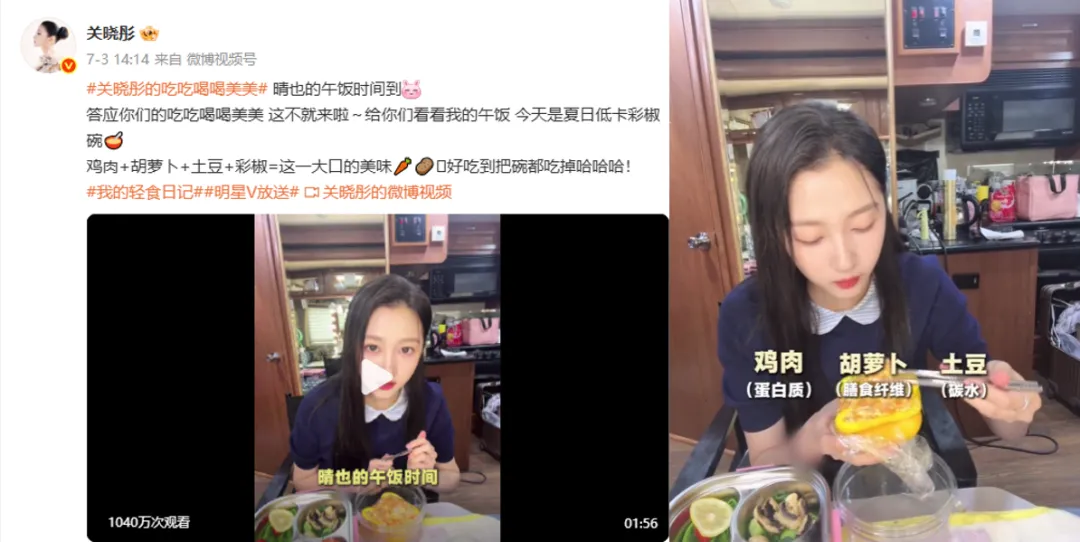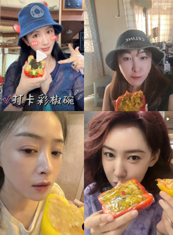 起因是上个月,关晓彤在微博晒出了妈妈特制的夏日低卡餐——将彩椒切成两半掏空作碗,填入煮熟的鸡肉、胡萝卜、土豆,连碗带馅一口闷,硬是把减肥餐吃出了全家桶(碳水蛋白质维生素版)的豪横感。