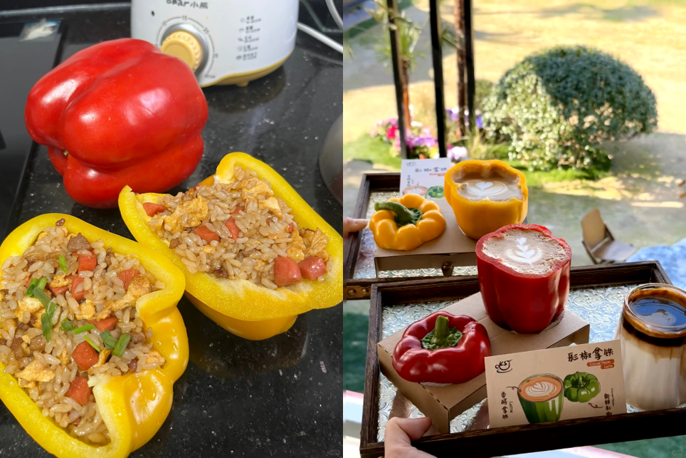 彩椒的碗,就和贝果的洞一样,注定充满想象。于是网友们复刻“彤款”彩椒碗里的食材逐渐丰富,也逐渐抽象,从人见人恨的鸡胸肉变成了香香的大米饭,主打一个吃饱了才有力气减肥;能装吃的,自然也能装喝的,彩椒咖啡也出现了,还能直接在肚子里实现杯子无害化处理。