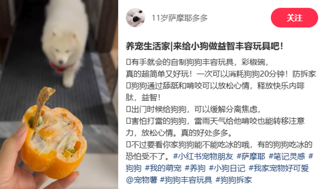 是的,图上这个与关晓彤同款彩椒碗查重率几乎100%的狗狗丰容碗,主要材料也来源彩椒,做法也是将各类食材煮熟后塞进彩椒中,目的是让狗狗通过嗅闻和啃咬彩椒碗时感受到探索的快乐,还有益于开发智力。