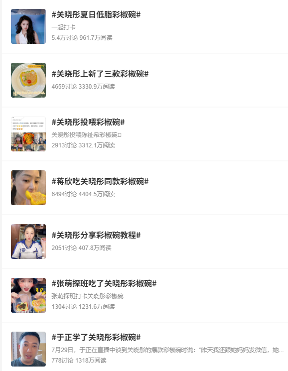 强捧出奇迹,连番轰炸的热搜终于将彩椒送上了C位出道。在微博上,关晓彤分享的彩椒碗视频合计播放量高达数千万,同时#彩椒碗#等相关话题在多个平台的热搜榜单上持续攀升,阅读量呈现显著增长态势。