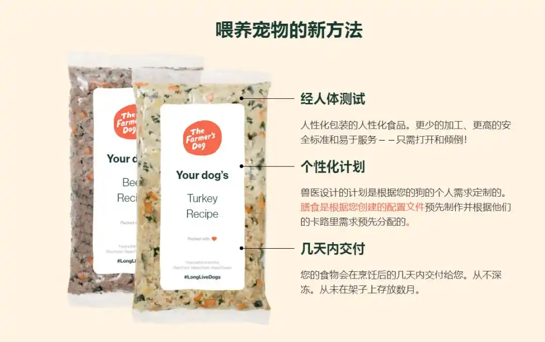 美国鲜食品牌The Farmer's Dog为用户提供定制化的食谱与配送服务,形成稳定的客户关系