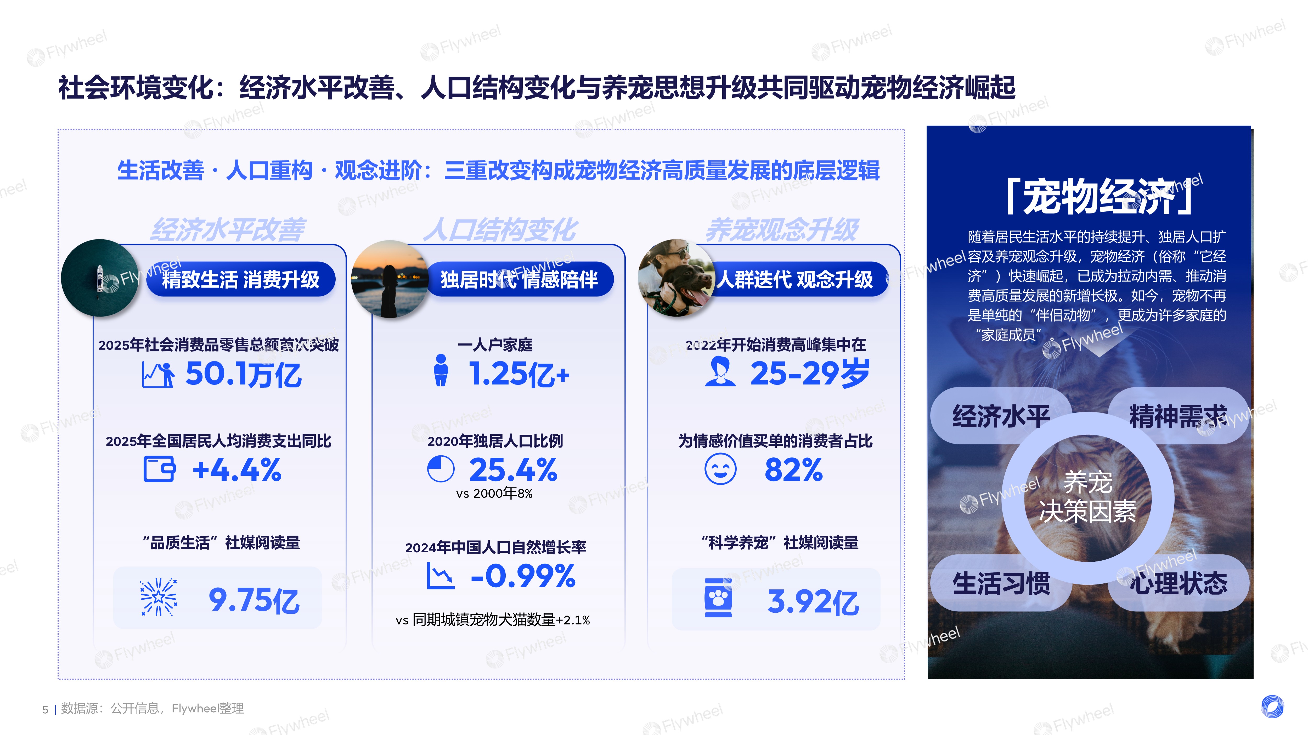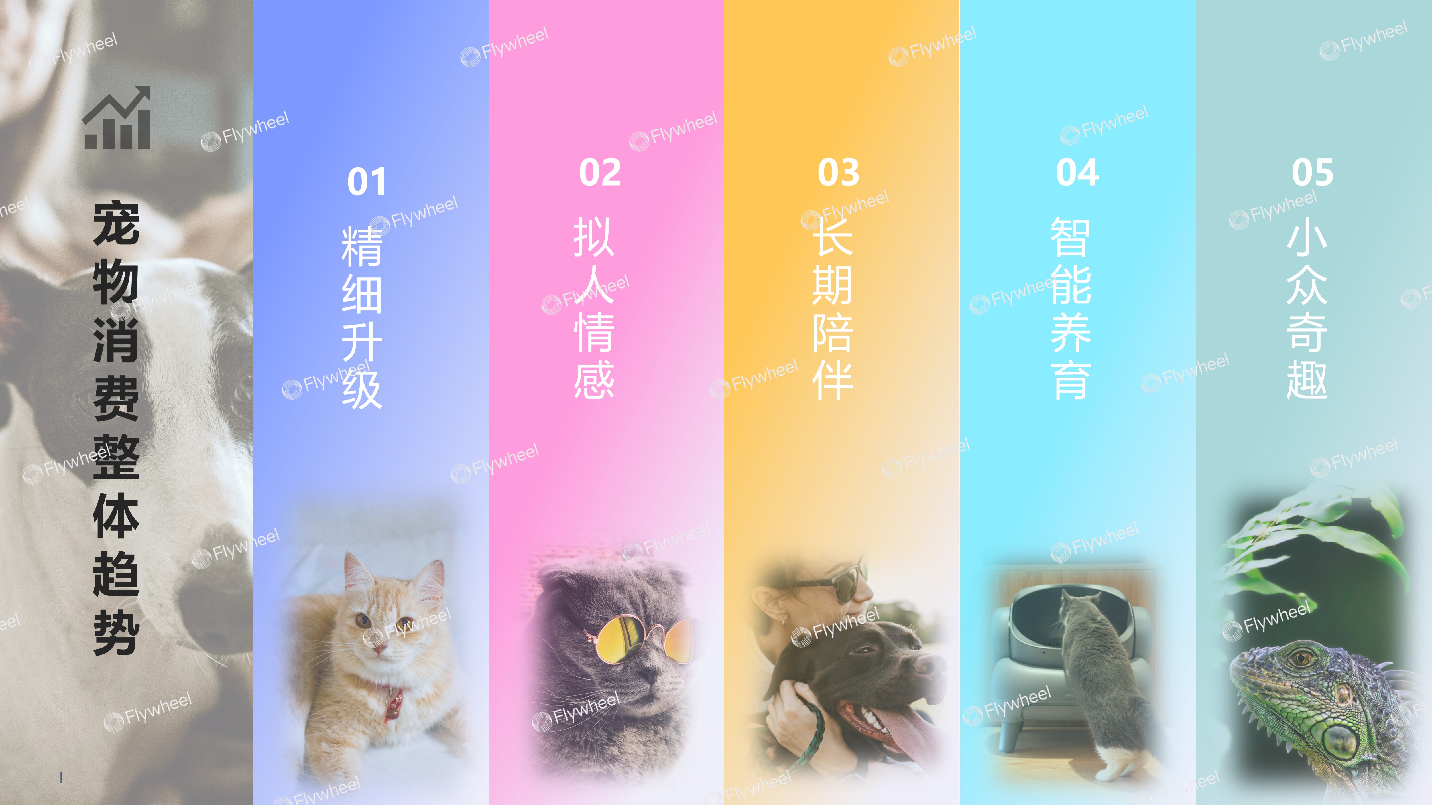 社会迭代带来的经济、心理、技术变革,与养宠心态从功能满足到情感、健康、智能、个性化的升级,共同推动宠物消费向多元、深度、创新的方向演进。由此,Flywheel飞未总结了宠物消费五大趋势。