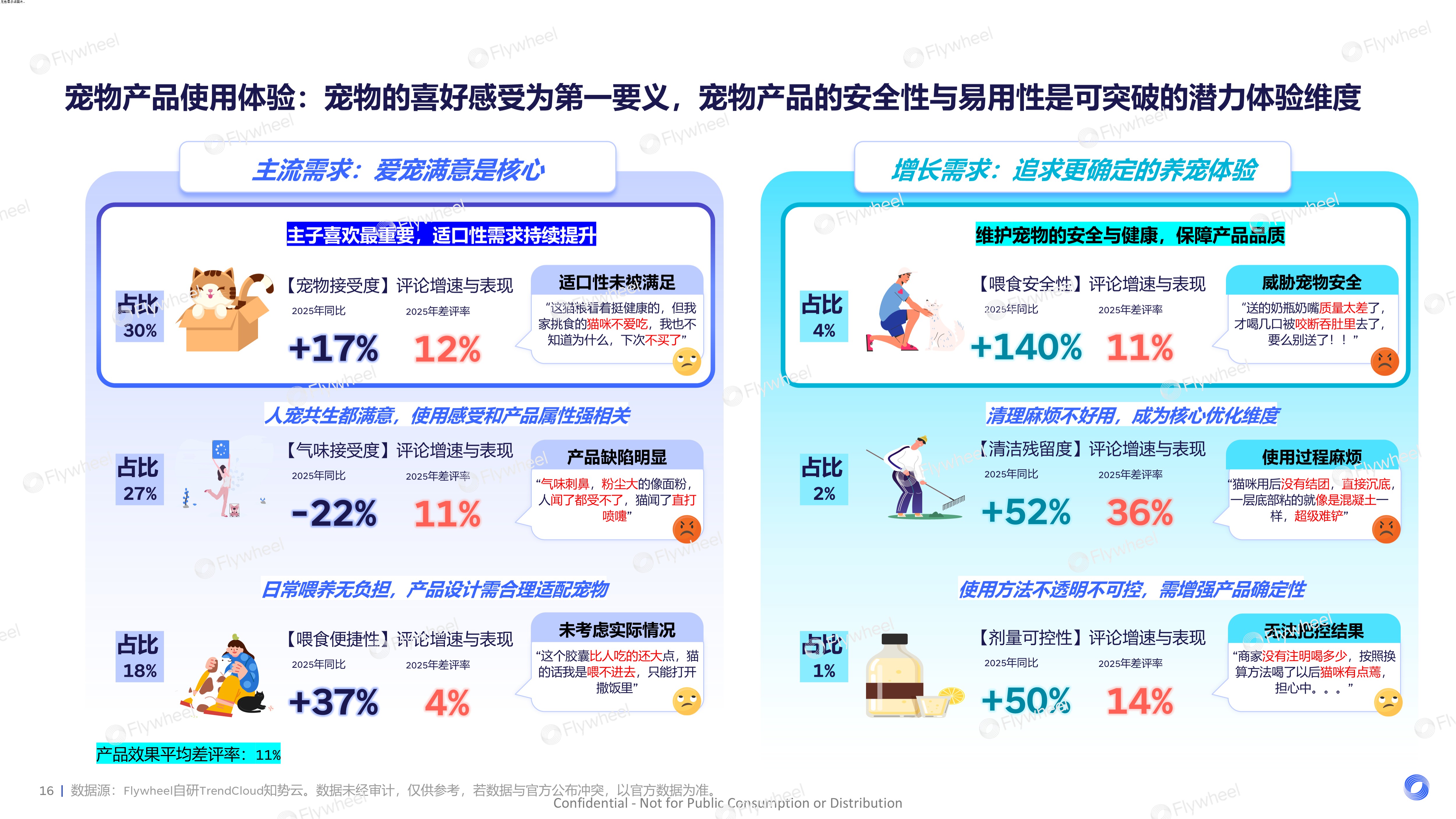 在增长需求维度,安全与易用性成为亟待突破的潜力方向。喂食安全性、清洁残留度、剂量可控性这三个维度虽占比较小,但增速很快,已成为体验优化的关键突破口。宠物产品体验的核心逻辑正从满足宠物基本需求向兼顾宠物偏好、主人便利与安全升级,因此,只有将宠物真实偏好与主人使用痛点深度结合,在安全性与易用性上实现突破,才能推动产品从可用向好用、放心用进阶。