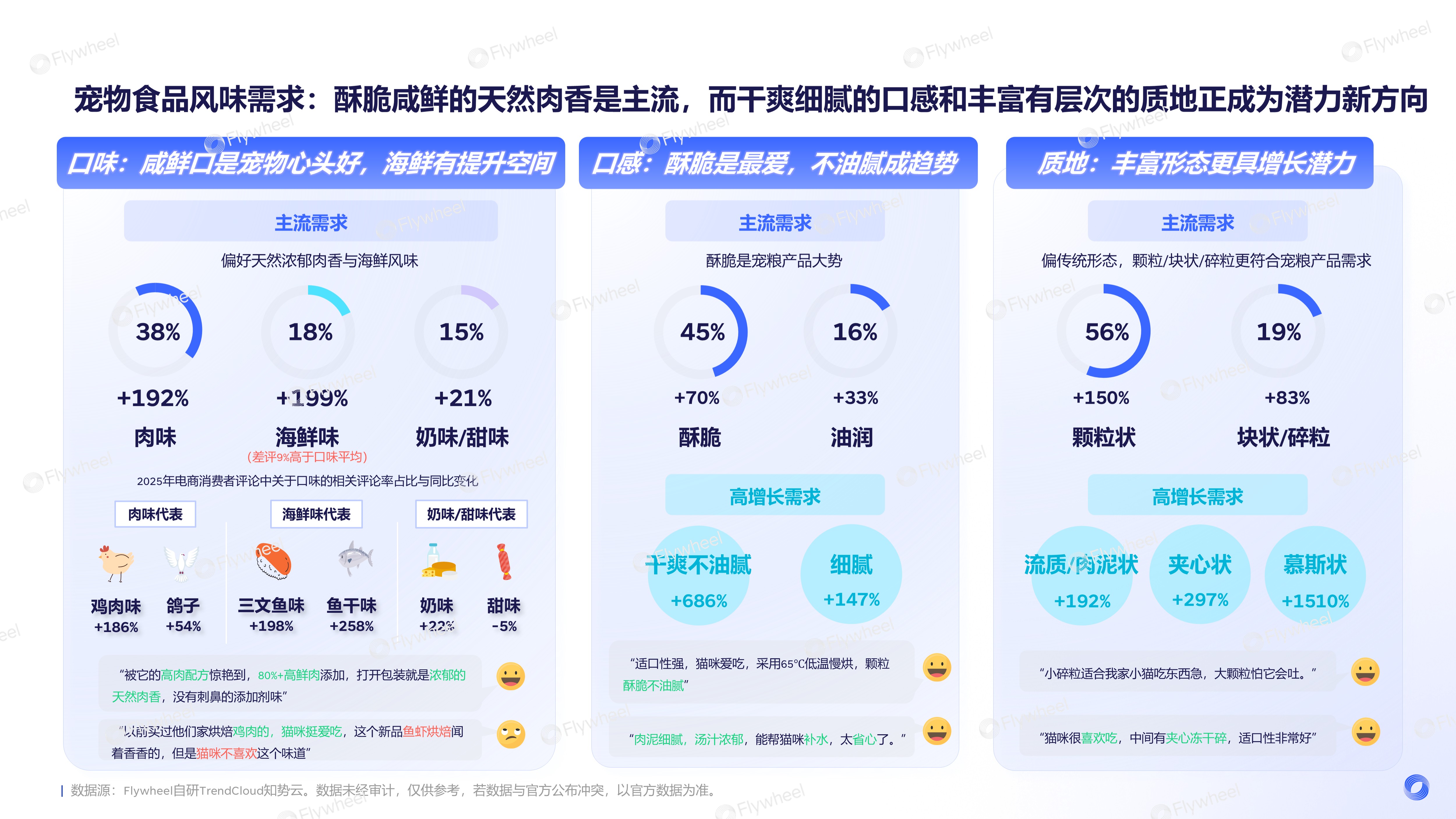 这种口味偏好直接投射到口感需求上,酥脆、干爽细腻的体验成为主流偏好,如“65℃低温慢烘”工艺带来的酥脆不油腻质感,既满足宠物咀嚼需求,又避免了油腻带来的健康顾虑;而“细腻”口感以147%的增速崛起,肉泥细腻、汤汁浓郁的产品能同时解决补水与适口性问题,成为细分场景下的热门选择。