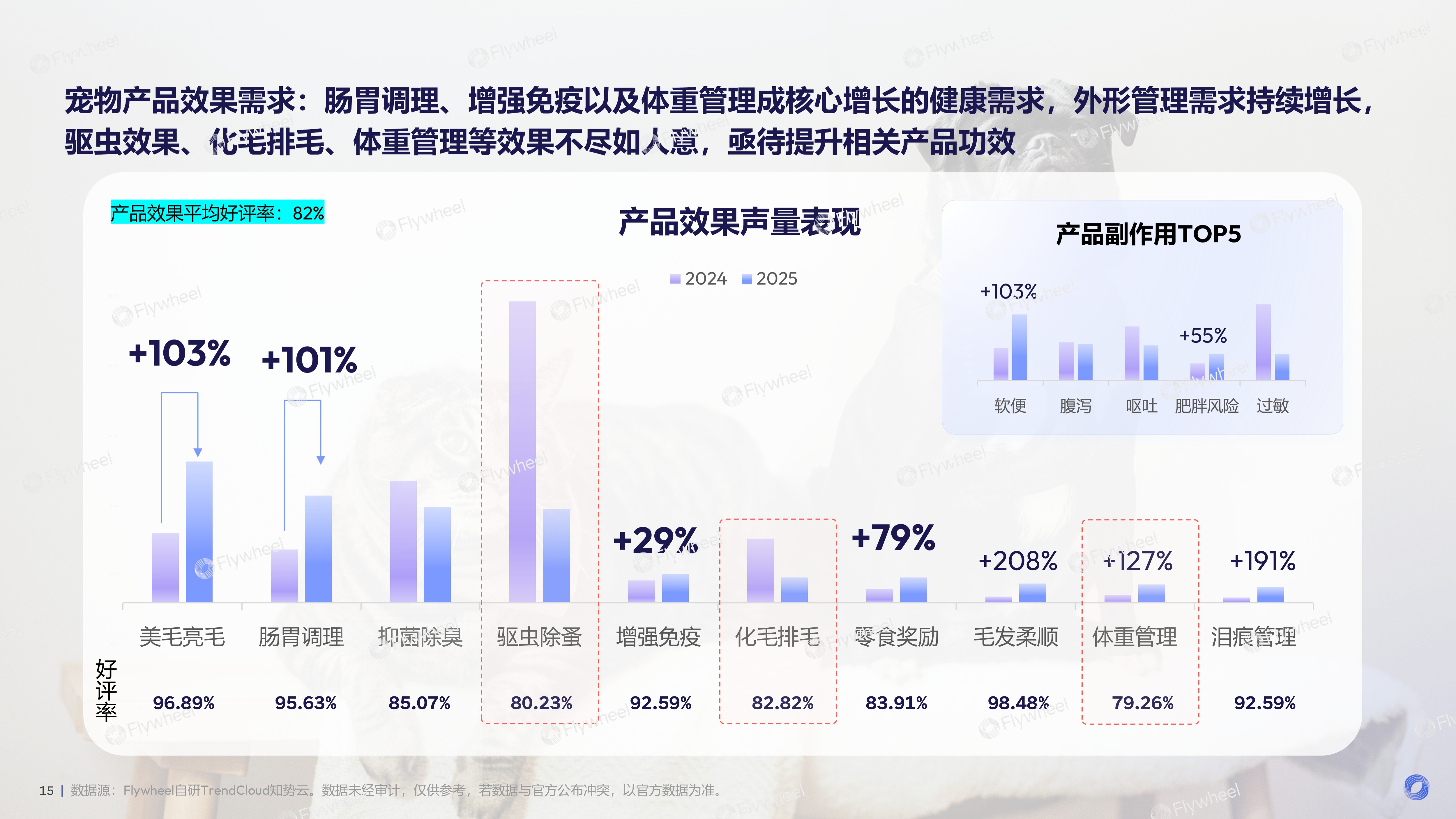 与此同时,驱虫除蚤、化毛排毛声量同比下滑严重,且好评率相对偏低,尤其是体重管理好评率仅79.26%,反映出这些领域存在功效提升的迫切性,现有产品的效果未能充分满足期待在技术迭代或配方优化上还有较大空间。