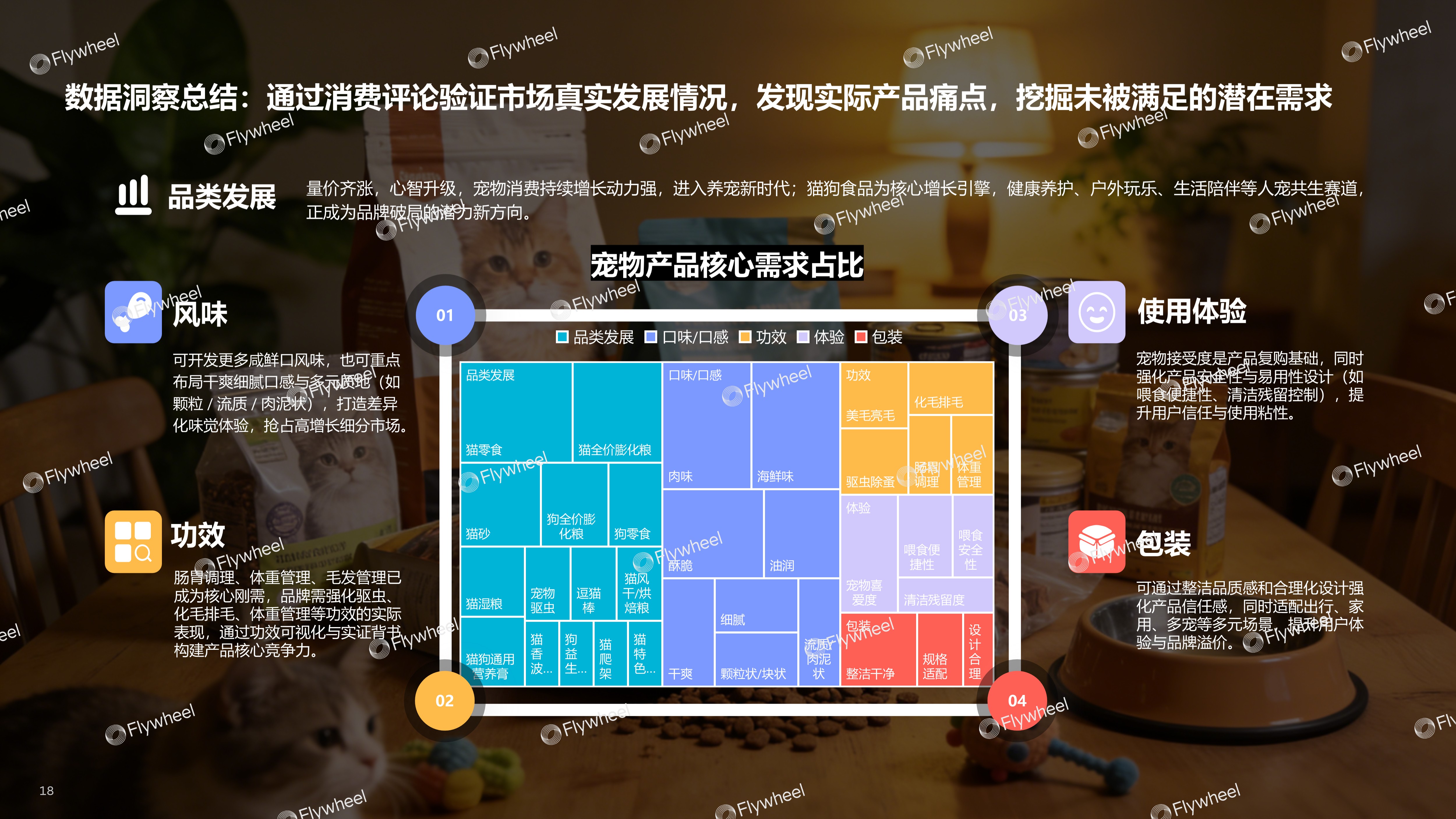 因此,针对宠物食品口味/口感、宠物产品的效果需求、使用体验及包装需求这四个备受关注的维度,我们进一步展开分析,以探寻其中具体的消费需求与尚未满足的痛点。
