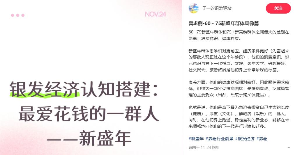 诚然,我们无法忽视的是,除了具备较强消费力的“新老人”外,仍有大量老年人受限于收入水平,难以负担高品质养老服务。也正因如此,撬动银发经济的关键并非试图满足所有老年群体的泛化需求,而是精准锚定特定群体,聚焦其未被满足的个性化、品质化需求深耕细作,方能真正抓住这片蓝海的发展先机。