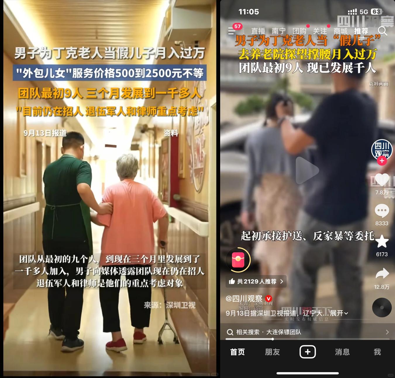 今年,一种名为“外包儿女”的服务在社交媒体上走红。从陪诊取药、家电维修到节日陪伴、手机教学,甚至是假装至亲为养老院老人“撑腰”或调解矛盾,外包儿女的业务范围广泛,服务价格也有明显的梯度差异,除基础时薪外,服务价格还与城市等级、服务精细化程度,甚至服务者的学历背景紧密挂钩。这种明码标价的“亲情服务”,正成为许多家庭应对养老压力的现实选择。