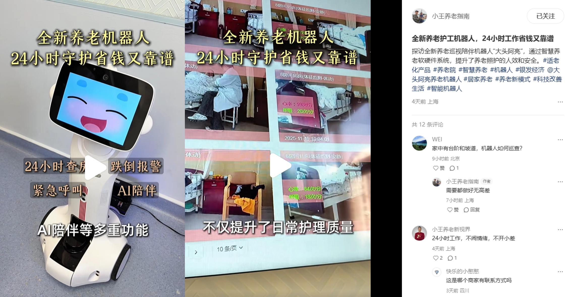 例如腾讯在2024年推出的养老机器人“小五”,不仅可以取快递、推轮椅,还能抱扶辅助老人起身,降低护工的劳动强度;江苏艾雨文承开发的“大头阿亮”,不仅拥有灵活多样的陪护模式,能够解决居家养老中长者普遍缺乏陪伴的问题,还入驻了多家养老院,为缺乏护理人员的养老院和老人提供24小时守护,大大节省人力。