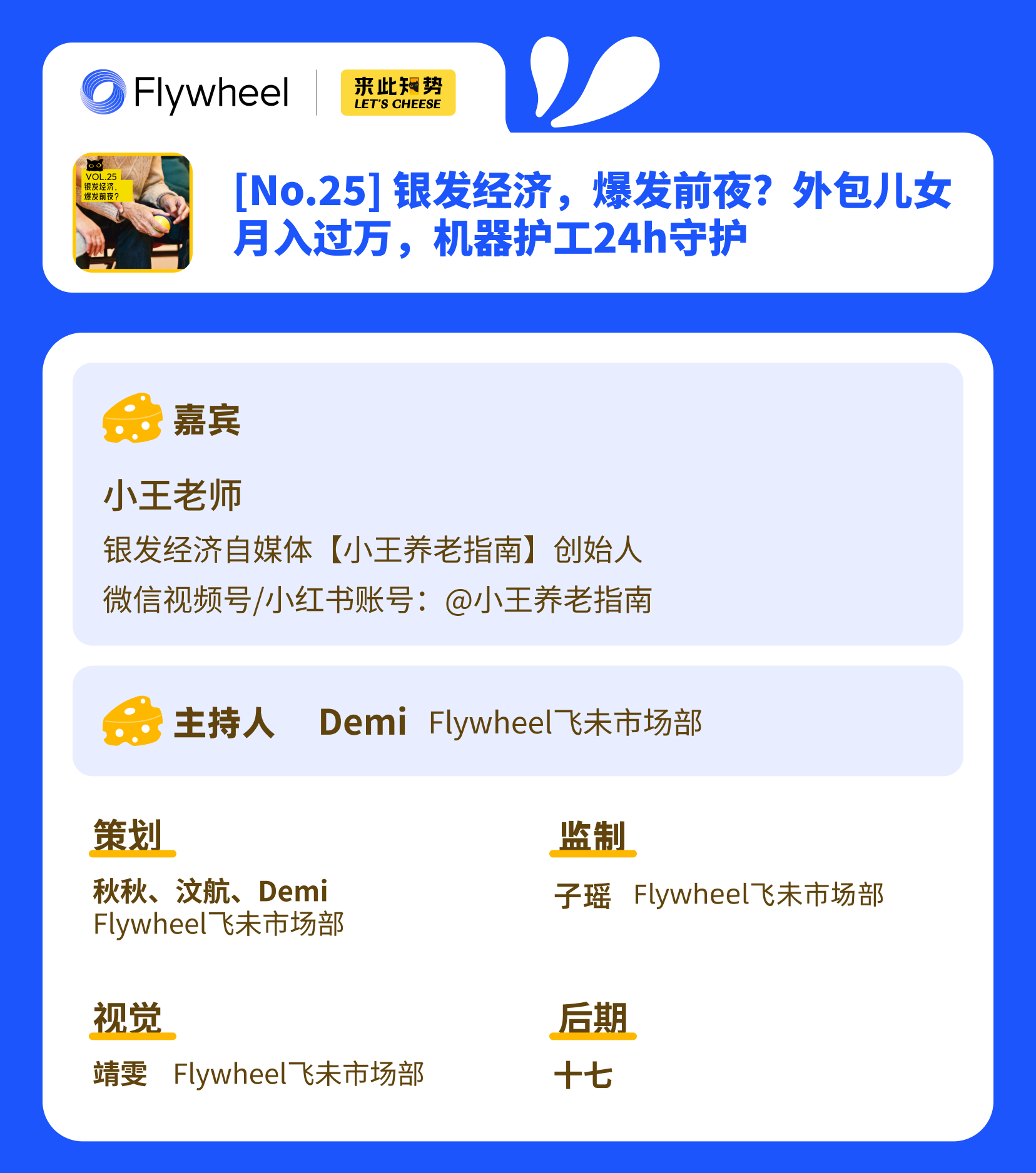 本期内容选题来自Flywheel飞未出品的播客对话栏目《来此知势》第25期节目《银发经济,爆发前夜?外包儿女月入过万,机器护工24h守护》,欢迎收听。